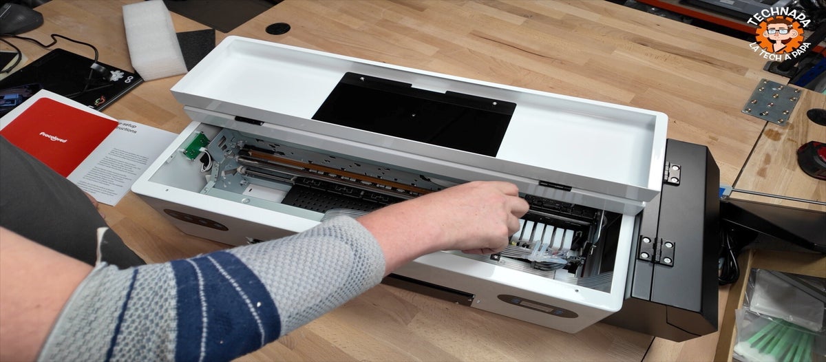 L’imprimante elle-même intègre des dispositifs utiles, comme un système de circulation de l’encre blanche pour éviter les dépôts, un cutter intégré pour le film et une surface d’impression en format A3, bien adaptée aux vêtements et accessoires.