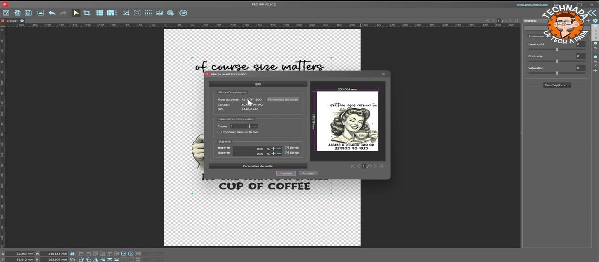 Le logiciel RIP permet d’importer les visuels, de gérer le profil d’impression, le miroir nécessaire au transfert, et les couches d’encre (couleur + blanc).