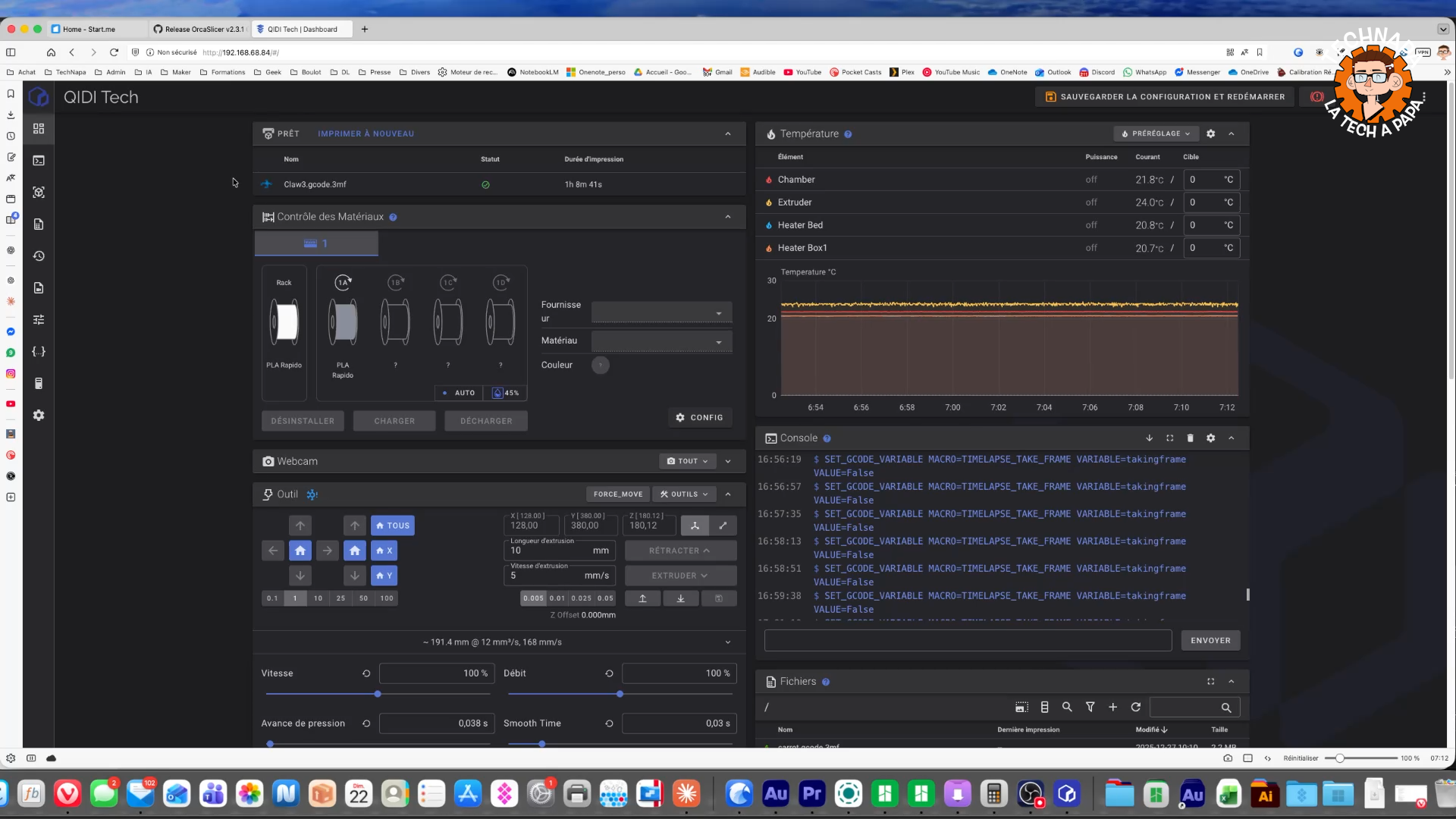 Pour aller plus loin, la machine tourne sous Klipper avec une interface Fluidd accessible directement via le navigateur en tapant l'adresse IP. Cela ouvre l'accès aux fichiers de configuration et à toutes les options avancées du firmware — à manipuler avec précaution si on ne maîtrise pas Klipper. C'est précisément ce qui fait la force de cette machine : elle est accessible en utilisation standard, mais ne bride pas ceux qui veulent aller plus loin.
